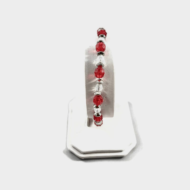 This bracelet is made with 6mm acrylic red and white beads and silver colored spacer beads. Comes in several lengths and clasp types