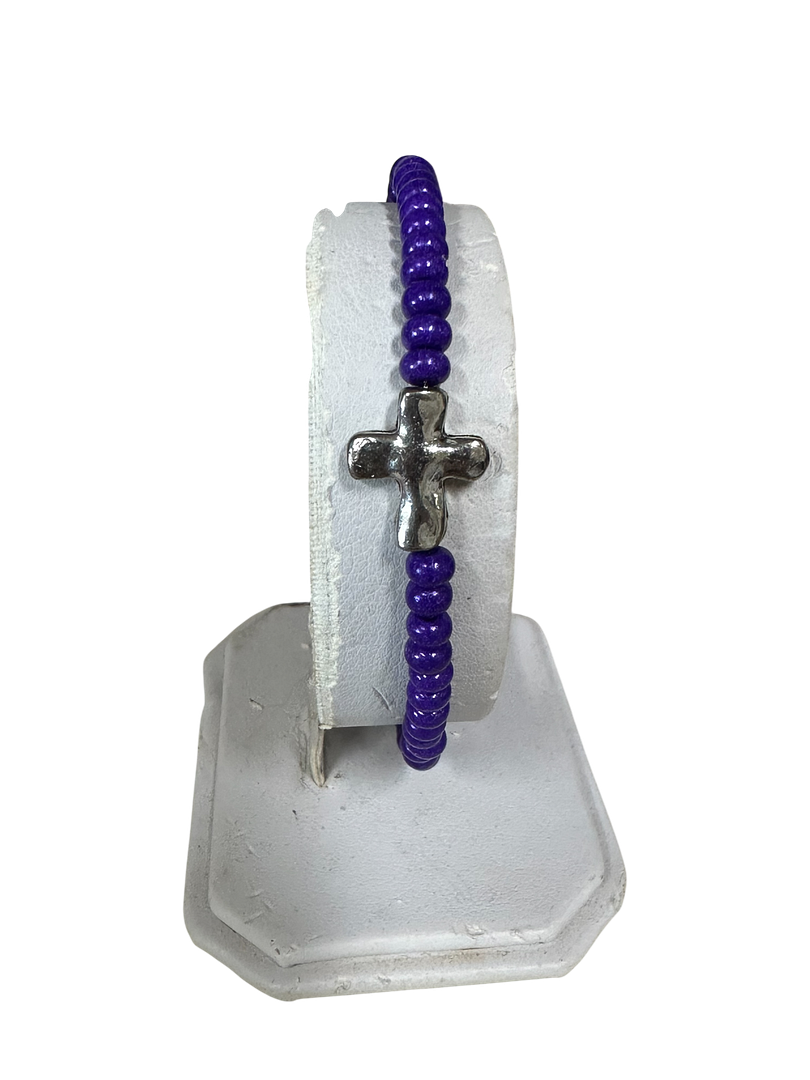 Product Description Bracelet made of 8/0 Czech beads in assorted colors with a small silver cross in the center.