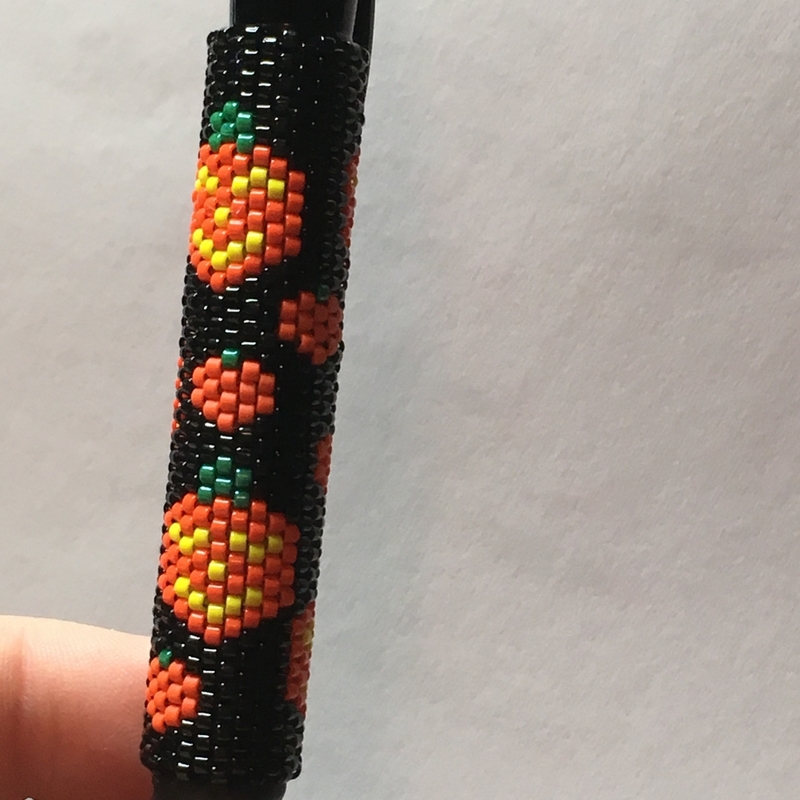 A peyote beaded pen with cute pumpkins and Jack o Lanterns on it. You can remove the beaded pen cover and put on another pen or you can just buy replacement ink for this pen. The cover fits perfectly on any Pilot G2 pen which is included. Replacement ink is not included. The pen has black ink. The beaded pattern of the cover was designed by Carolyn DeGroff