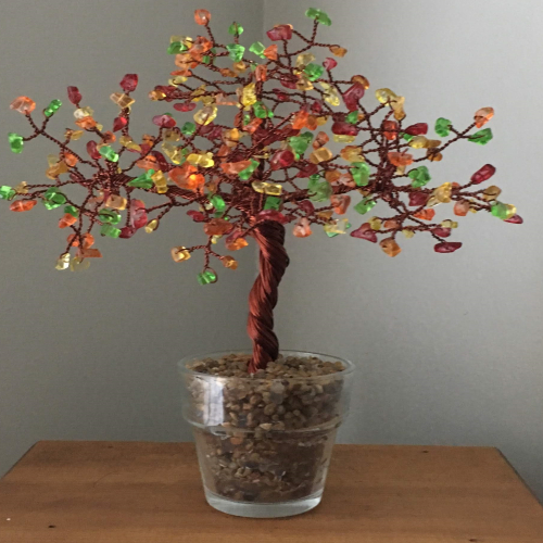 A beautiful handmade autumn tree made with glass chips and enameled copper wire in your choice of colors. Stands approximately 10 inches tall