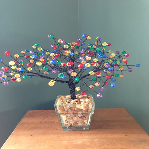 A tree that will never die and be beautiful forever! Made with 6mm glass beads and 22 gauge enameled copper wire. Stands approx. 9 inches tall but may vary a bit since they are handmade Currently only comes in black for the bark but more colors coming soon! Vase and rocks may vary according to availability