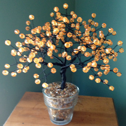 This tree is made with 6mm orange acrylic beads and 22 gauge black enameled copper wire. Stands approx 9 inches tall. Vase and rocks may vary according to availability