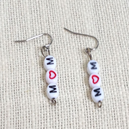 Made with acrylic alphabet beads that spell "mom" with a heart as the O on surgical steel fish hook earrings. Great gift for Mother's Day or anytime