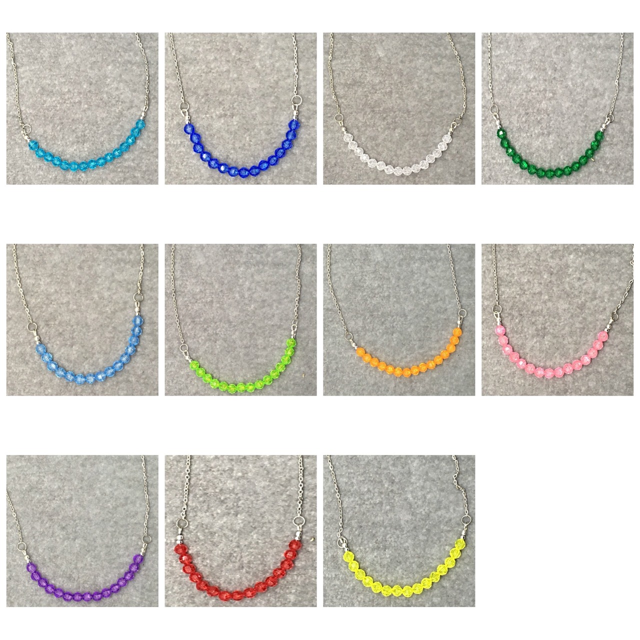 A beautiful 18 inch necklace made with silver plated chain and 6mm acrylic beads of different colors that sit right at your collar bone. I chose to only make this have a lobster clasp option but if you would like the barrel clasp please feel free to contact me