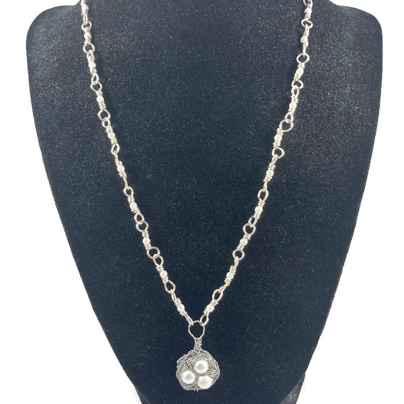 A beautiful 18" bird's nest necklace made with silver plated wire and pearls representing the eggs. Handmade silver plated clasp attached. If you would like more eggs in the nest, just message me in the chat at the bottom of the page