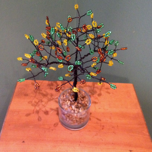 This tree is made with transparent yellow, brown, and green size 11 seed beadsin a camoflauge pattern and black wire
